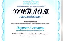 Поздравляем Исмагилова Рената лауреата III степени и с победой в Международном фестиваль-конкурсе — "Хрустальное сердце мира" класс преподавателя Петровой Ольги Евгеневны