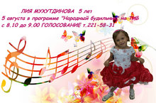 Друзья! Лия Мухутдинова очень нуждается в Вашей поддержке!!! Мы участвуем в телеконкурсе ТНВ "Народная сцена" и благодаря зрительскому голосованию вошли в пятерку лучших детских номеров!!! Теперь нашу судьбу решаете Вы!!! Только на этой неделе ведется голосование за пять номеров и будет определен единственный победитель, который пройдет в Финал!!! ЗА ЛИЮ голосование 5 августа в ПЯТНИЦУ (во время программы "Народный будильник") с 8.10 до 9.00 путем телефонных звонков!!! (Звонок бесплатный, неограниченное кол-во звонков) Очень просим поддержать нас!!!