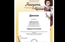 Поздравляем Шабалину Катю.! Она стала лауреатом 3 степени на интернет-конкурсе Мелодинка. Преподаватель Ядова И.В.