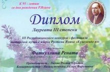 Поздравляем Фаткуллину Ренату , ставшую лауреатом 3 степени 3 респебликанского конкурса татарской музыки имени Рустема Яхина . Преподаватель Лядова Оксана Юрьевна, концертмейстер Низамутдинова Диляра Фаритовна!