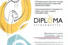 Поздравляем Закирову Айназ- дипломанта 1 степени , участницу 1 Международного конкурса-фестиваля "Золотая лира"