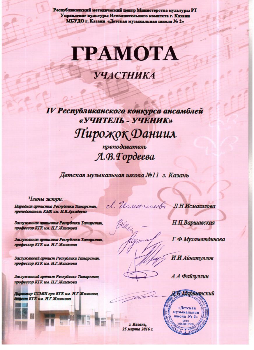 12 Пирожок Даниил, Грамота участника в IV Республиканском конкурса "Учетель-ученик"