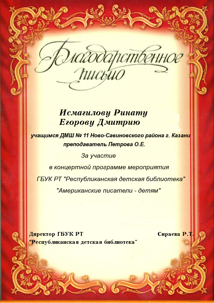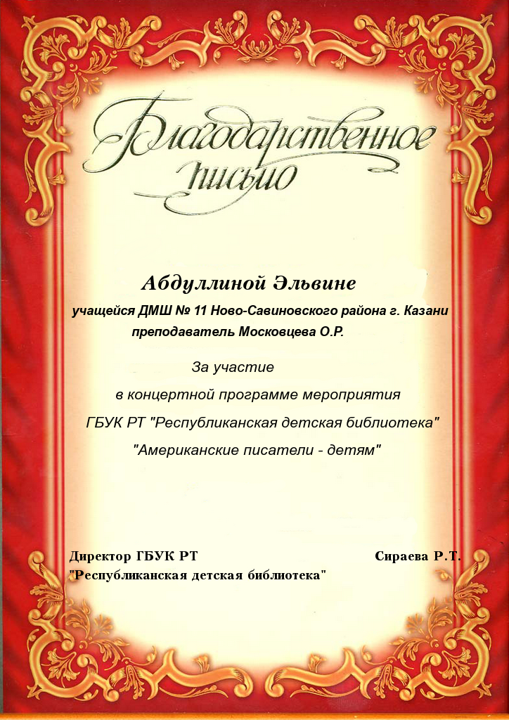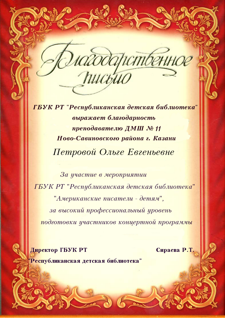 Благодарность ГБУК "Республиканская детская библиотека" Александровой В.Р., Кибардиной Н.М., Носовой В.О., Ходжаевой Л.Р.