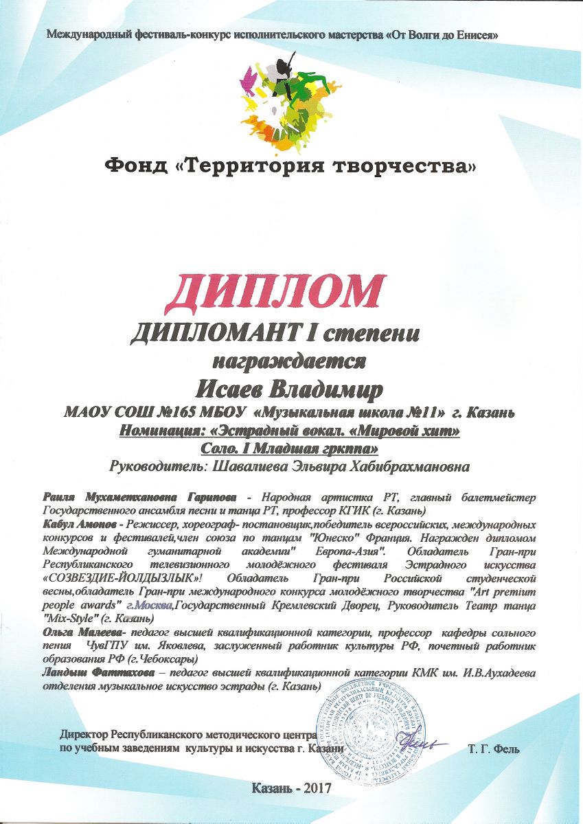 Опубликовано: 09.04.20178 апреля в Казани состоялся Международный конкурс "От Волги до Енисея". Успешно выступили на конкурсе учащиеся нашей школы Мингазова Альфия, ученица Оксаны Анатольевны Сливченко, ставшая Лауреатом II степени; Нигометзянова Аселя, ученица Эльвиры Хабибрахмановны Шавалиевой, ставшая лауреатом II степени, Исаев Иван, ученик Эльвиры Хабибрахмановны Шавалиевой, ставший Дипломантом I степени. Поздравляем!