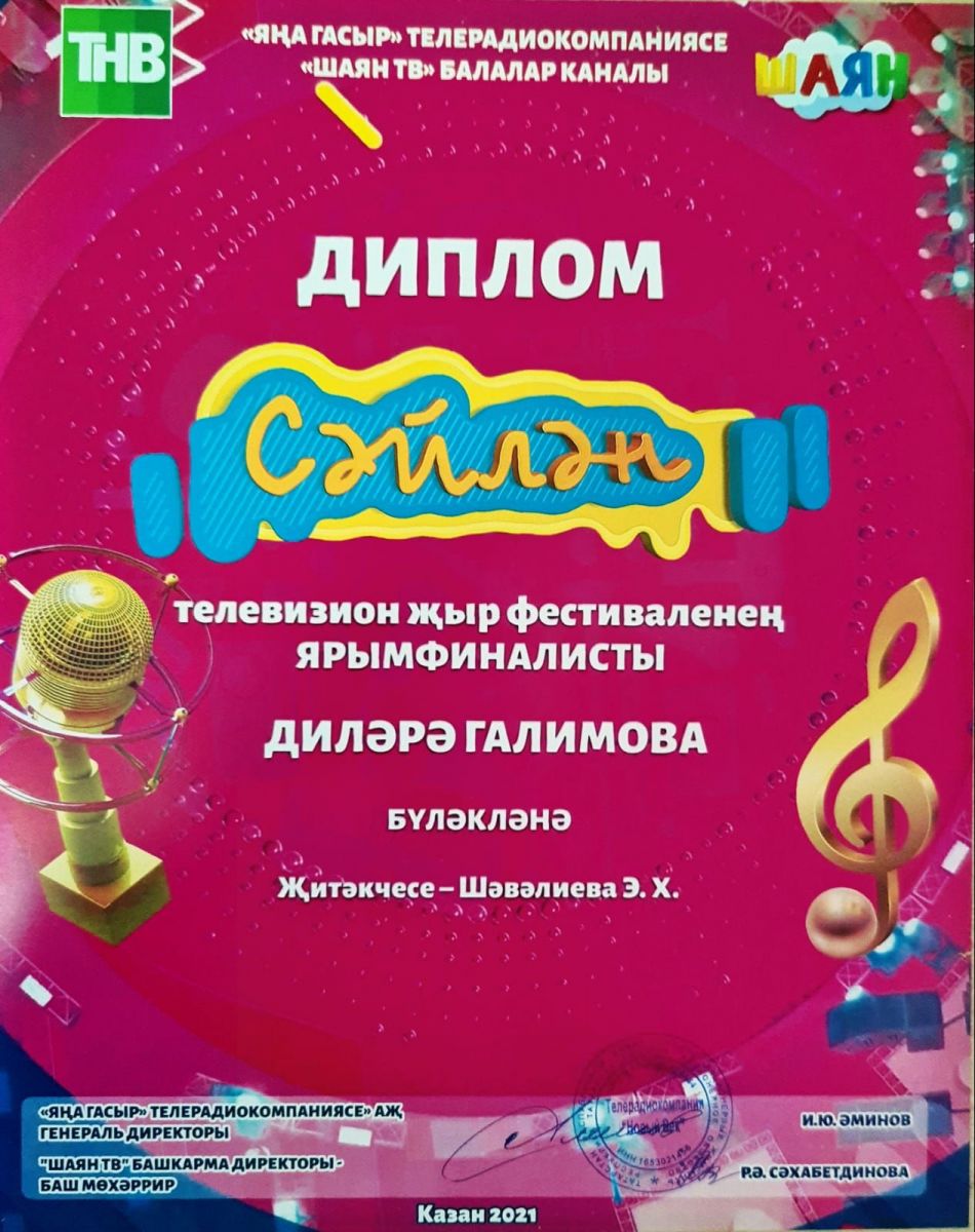 Диляра Галимова, учащаяся ДМШ №11, успешно прошла все отборочные туры и приняла участие в финале республиканского детского фестиваля-конкурса «Сэйлэн». (преподаватель Эльвира Хабибрахмановна Шавалиева – заслуженная артистка РТ Эльвира Розали).