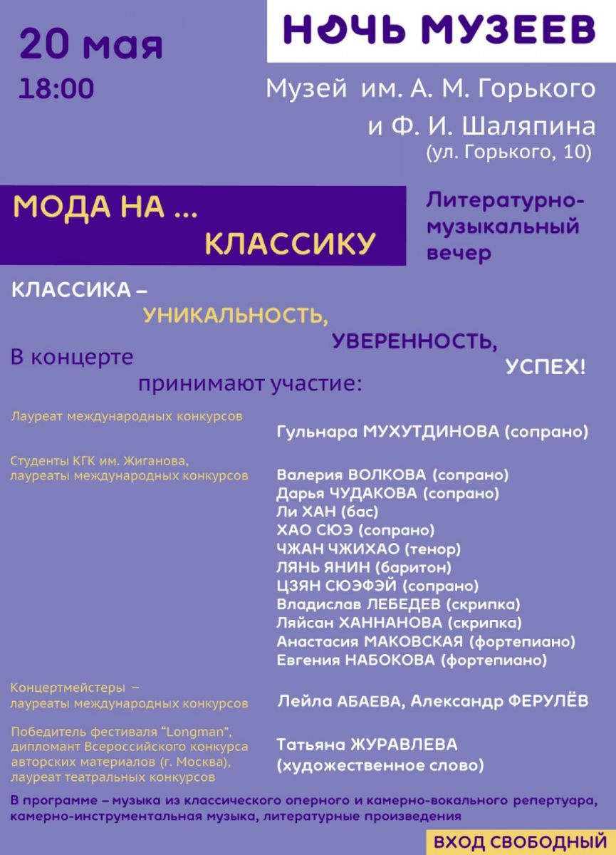 Вечером субботы 20 мая в музее М.Горького и Ф. Шаляпина состоялся концерт камерной музыки с участием студентов Казанской консерватории и Гульнары Мухутдиновой (сопрано), - преподавателя нашей школы по классу вокала.