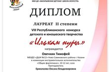 Поздравляем с успешным выступлением на VIII Республиканском конкурсе детского и юношеского творчества "Ильхам нуры" воспитанников преподавателя Ермолаевой О.В. в номинации инструментальное исполнительство "Общее фортепиано" :