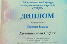 Поздравляем с успешным выступлением на Межрегиональном конкурсе инструментального искусства "FORTE" воспитанницу преподавателя Замалетдиновой Диляры Джаудатовны, дипломанта 1 степени - Калашникову Софию в номинации "Общее фортепиано", 11-12 лет. Желаем дальнейших успехов!
