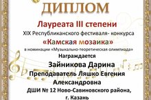 Поздравляем с успешным выступлением на XIX Республиканском фестиваль-конкурсе "Камская мозаика" воспитанницу преподавателя Евгении Александровны Ляшко