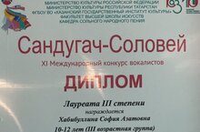 3. Хабибуллину Софию - Лауреата 3 степени в номинации "Эстрадный вокал на татрском языке. Соло". 9-10 лет. Преподаватель Самигуллина Л.И.