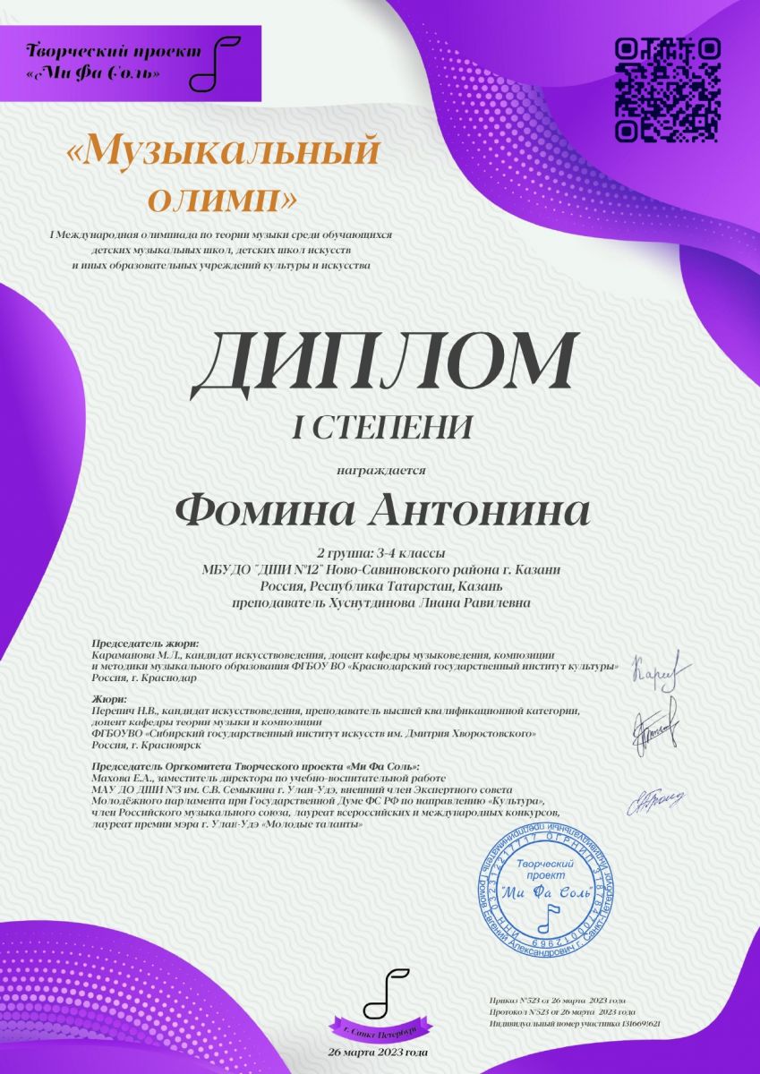 Поздравляем Фомину Антонину - Дипломанта I степени I Международной олимпиады по теории музыки среди обучающихся детских музыкальных школ, детских школ искусств и иных образовательных учреждений культуры и искусства "Музыкальный ОЛИМП", ученицу преподавателя теории музыки Хуснутдиной Л.Р.Желаем дальнейших успехов!