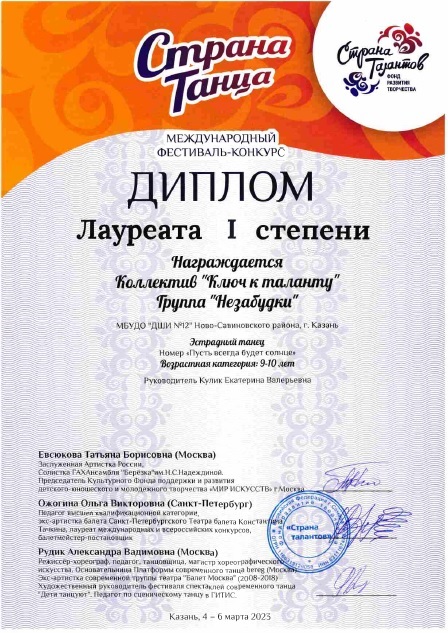 Поздравляем с успешным выступлением на Международном фестиваль-конкурсе "Страна Танца" Хореографический коллектив "Ключ к таланту" группу "Незабудки" - Лауреатов 1 степени (руководитель Кулик Е.В.). Номинация "Эстрадный танец", 9-10 лет.Желаем дальнейших успехов!