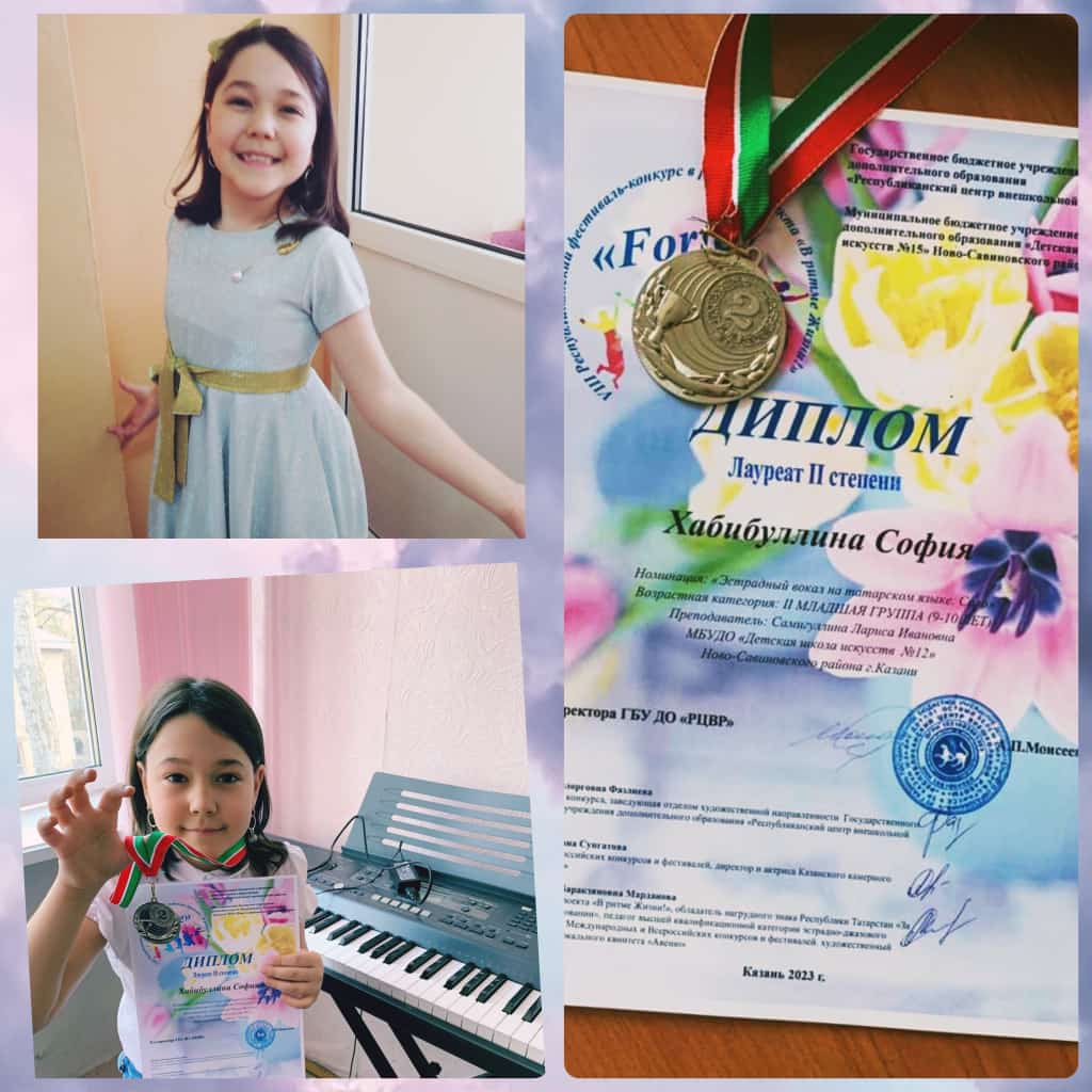 Поздравляем с успешным выступлением на VIII Республиканском фестиваль-конкурсе в рамках проекта "В ритме жизни!" "Forte":- Хабибуллину Софию - Лауреата 2 степени (преподаватель Самигуллина Л.И.) Номинация: Эстрадный вокал на татарском языке. Соло", 9-10 лет.