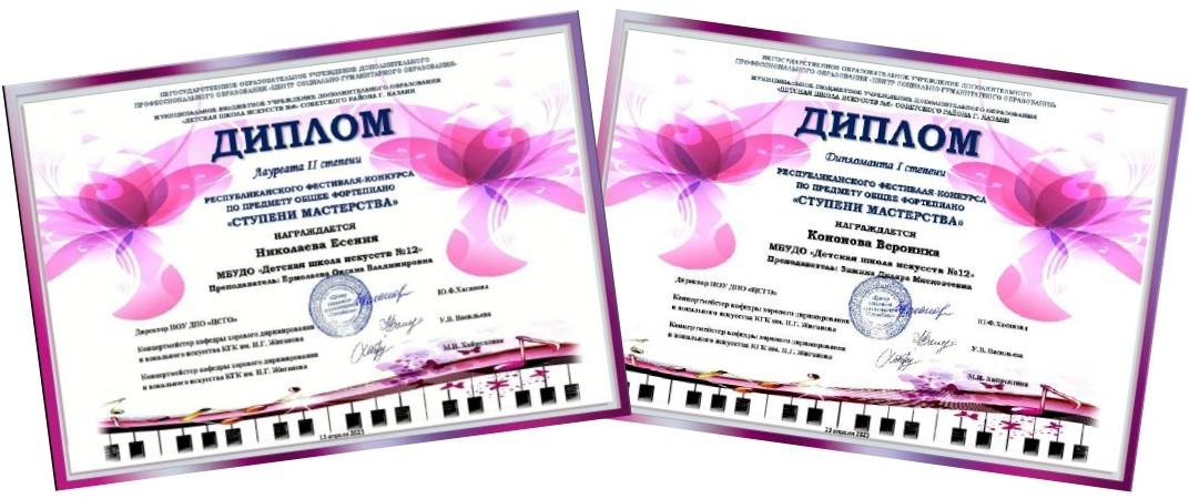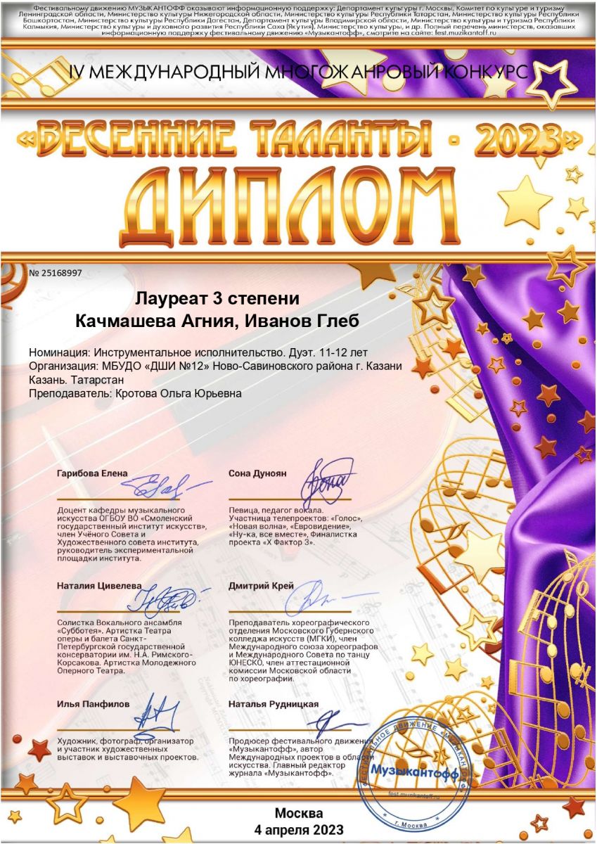 - Дуэт: Качмашева Агния, Иванов Глеб - Лауреат 3 степени (преподаватель Кротова О.Ю.) Номинация: Инструментальное исполнительство, Дуэт. 11-12 лет.