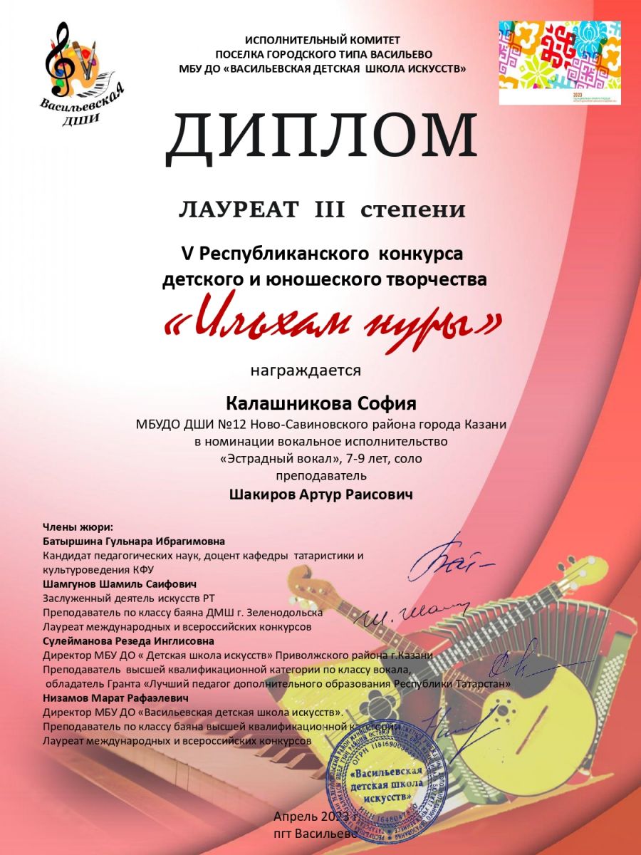 Поздравляем с успешным выступлением на V Республиканском конкурсе детского и юношеского творчества "Ильхам нуры" воспитанников преподавателя вокально-хоровых дисциплин Шакирова Артура Раисовича в номинации вокальное исполнительство "Эстрадный вокал", 7-9 лет,соло:- Бабичеву Ангелину - Лауреата 3 степени