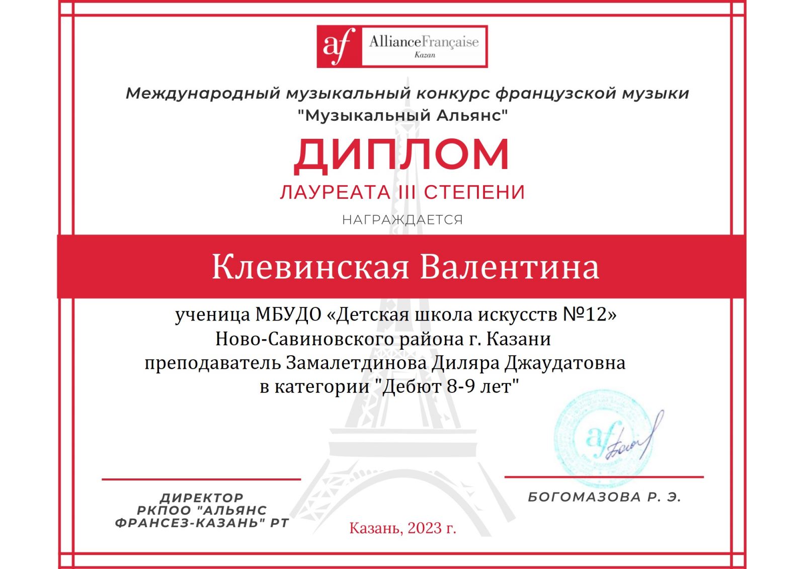 Поздравляем с успешным выступлением на Международном музыкальном конкурсе французкой музыки "Музыкальный Альянс":- Клевинскую Валентину - Лауреата 3 степени (преподаватель Замалетдинова Д.Д.), в категории "Дебют 8-9 лет"
