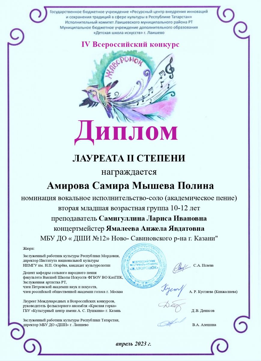 Поздравляем с успешным выступлением на IV Всероссийском конкурсе "Жаворонок":- Амирову Самиру, Мышеву Полину - Лауреатов 2 степени (преподаватель Самигуллина Л.И., концертмейстер Ямалеева А.Я.) номинация: вокальное исполнительство-соло (академическое пение), 10-12 лет