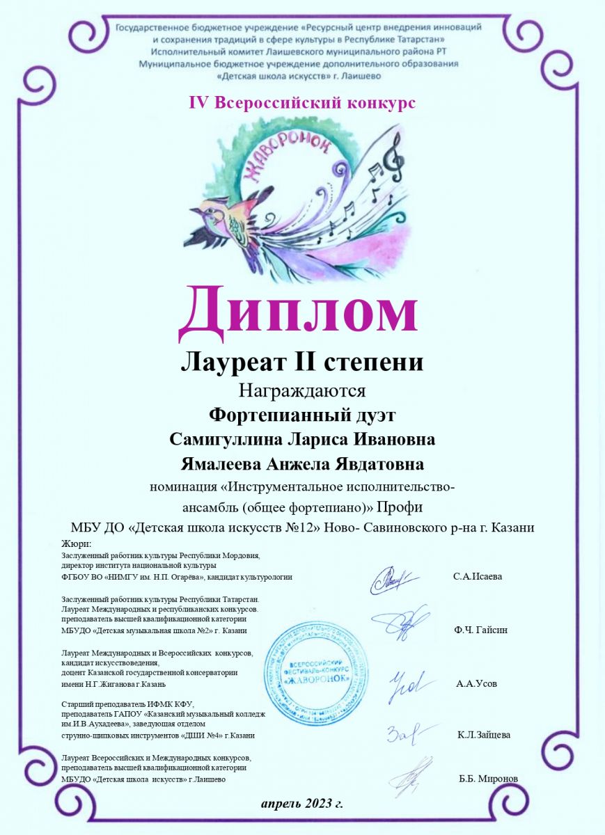 - Фортепианный дуэт преподавателей: Самигуллину Ларису Ивановну и Ямалееву Анжелу Явдатовну - Лауреатов 2 степени. Номинация "Инструментальное исполнительство" ансмбль (общее фортепиано)" Профи.