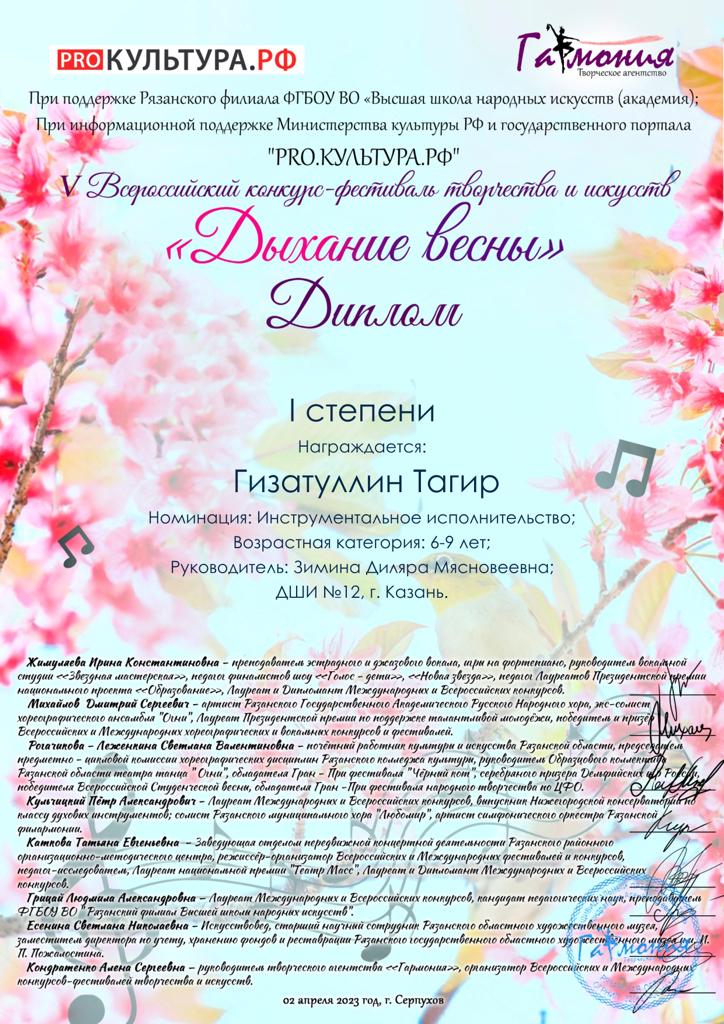 - Гизатуллина Тагира - Дипломанта 1 степени (преподаватель Зимина Д.М.)