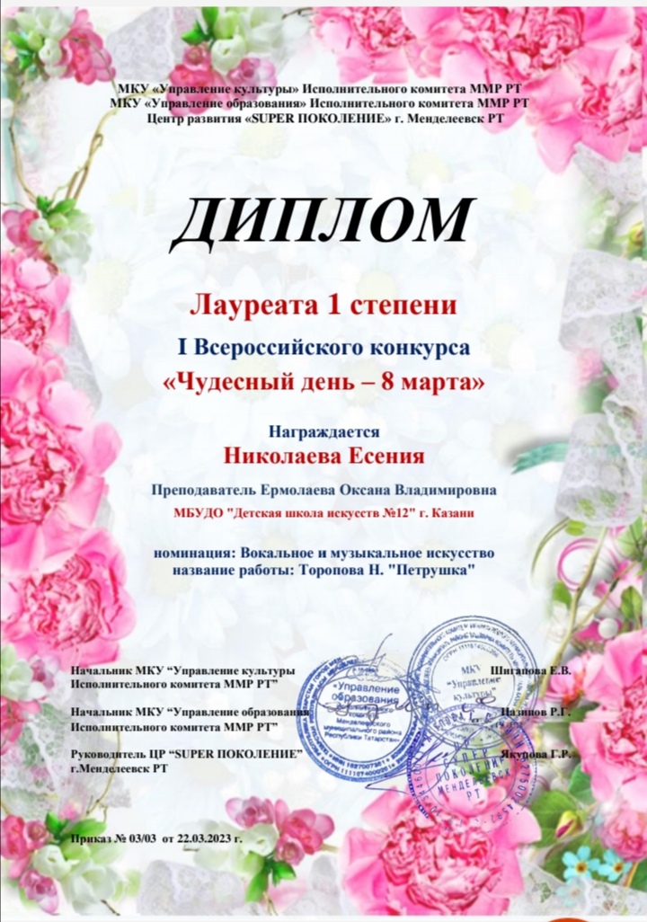 Поздравляем с успешным выступлением на I Всероссийском конкурсе "Чудесный день - 8 марта":- Николаеву Есению - Лауреата 1 степени (преподаватель Ермолаева О.В.). Номинация: Вокальное и музыкальное искусство.