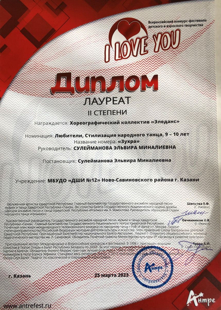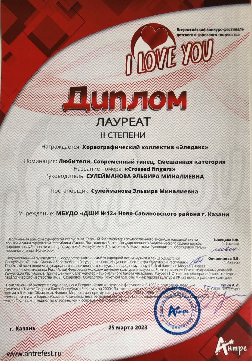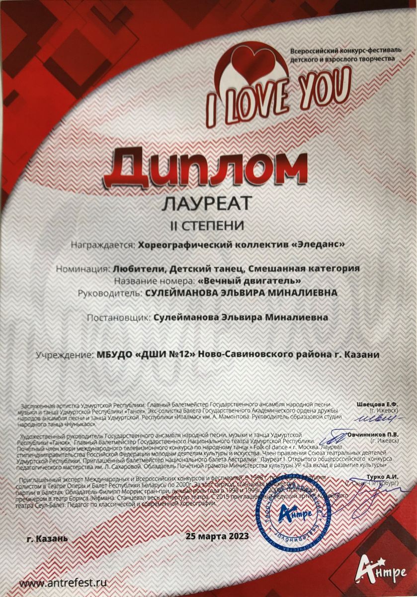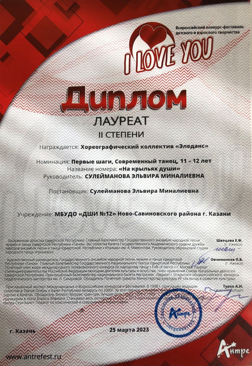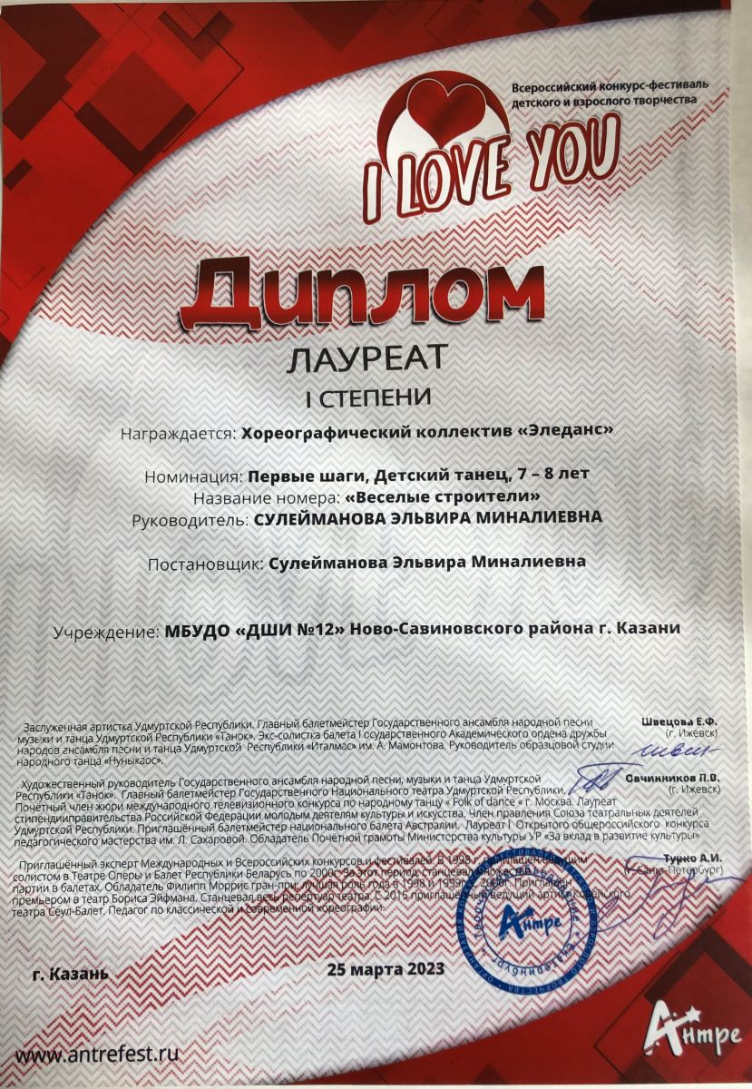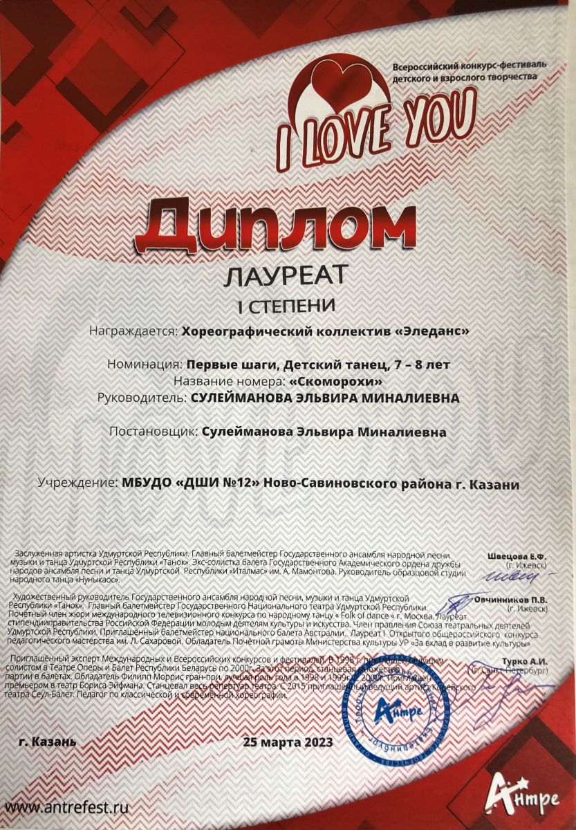 Поздравляем с успешным выступлением на Всероссийском конкурсе-фестивале детского и взрослого творчества "I LOVE YOU" хореографический коллектив "Эледанс" преподавателя Сулеймановой Э.М.:- Младшая группа - дважды Лауреаты 1 степени в номинации: Первые шаги, Детский танец, 7-8 лет