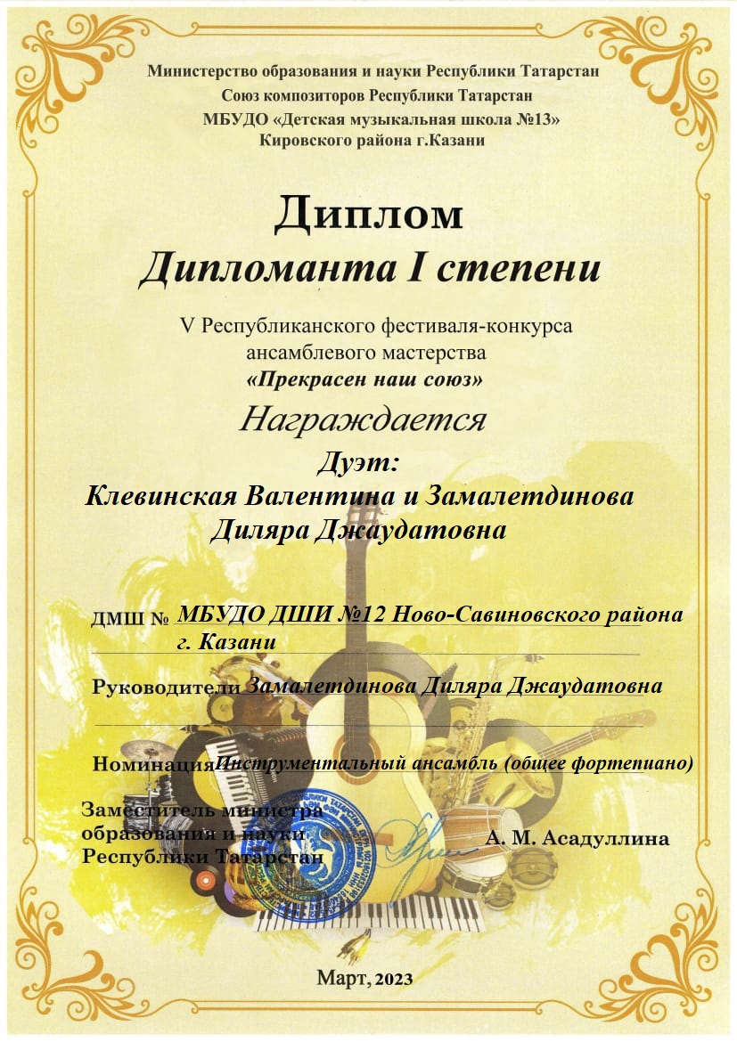 Поздравляем с успешным выступлением на V Республиканском фестиваль-конкурсе ансамблевого мастерства "Прекрасен наш союз" дуэт ученика и преподавателя:- Дуэт: Клевинская Валентина и Замалетдинова Диляра Джаудатовна - Дипломант 1 степени, в номинации "Инструментальный ансамбль (общее фортепиано)".