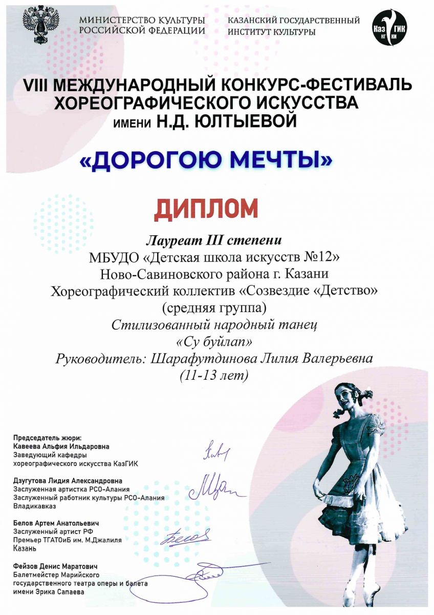 Поздравляем с успешным выступлением на IIIV Международном конкурсе-фестивале хореографического искусства имени Н.Д. Юлтыевой "ДОРОГОЮ МЕЧТЫ":- Хореографический коллектив "Созвездие "Детство"" (старшая группа) - Лауреатов 2 степени ( преподаватель Шарафутдинова Л.В.), номинация: Эстрадный танец.