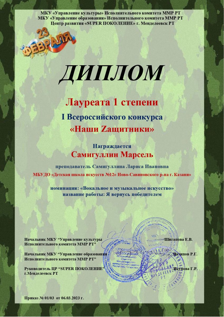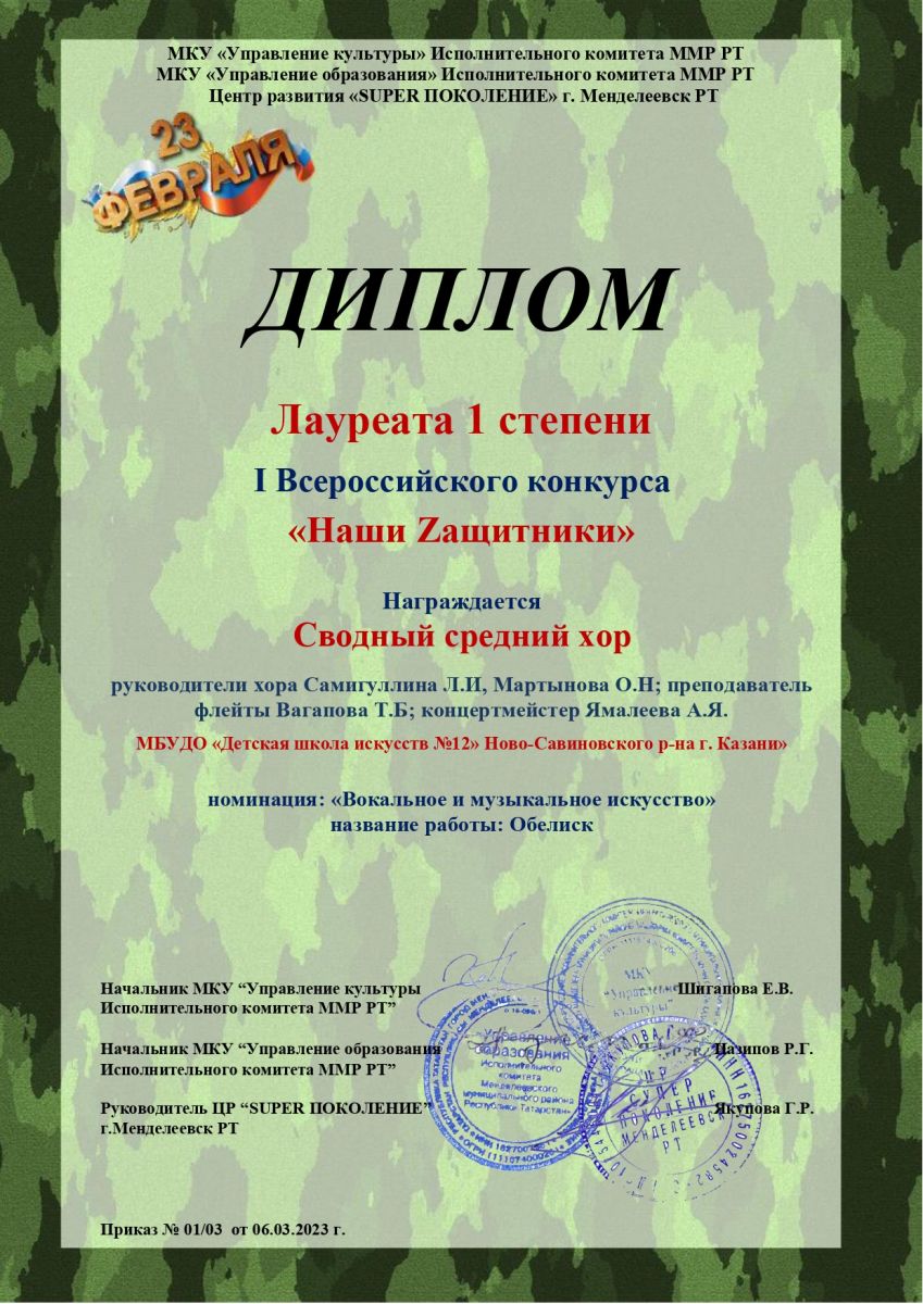 Поздравляем с успешным выступлением на I Всероссийском конкурсе "Наши Zащитники":- Сводный средний хор - Лауреаты 1 степени (руководители хора Самигуллина Л.И., Мартынова О.Н., преподаватель флейты Вагапова Т.Б., концертмейстер Ямалеева А.Я.). Номинация: "Вокальное и музыкальное искусство"