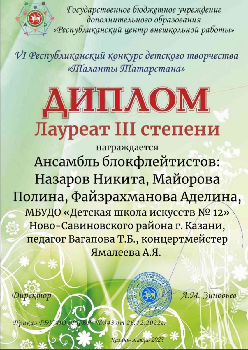 Поздравляем с успешным выступлением на VI Республиканском конкурсе детского творчества "Таланты Татарстана":- Ансамбль блокфлейтистов: Назарова Никиту, Майорову Полину, Файзрахманову Аделину - Лауреатов 3 степени (преподаватель Вагапова Т.Б., концертмейстер Ямалеева А.Я.)