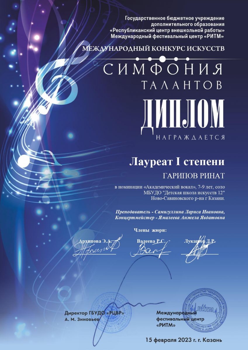 Поздравляем с успешным выступлением на Международном конкурсе искусств "Симфония талантов":- Гарипова Рината - Лауреата I степени (преподаватель Самигуллина Л.И., концертмейстер Ямалеева А.Я.)