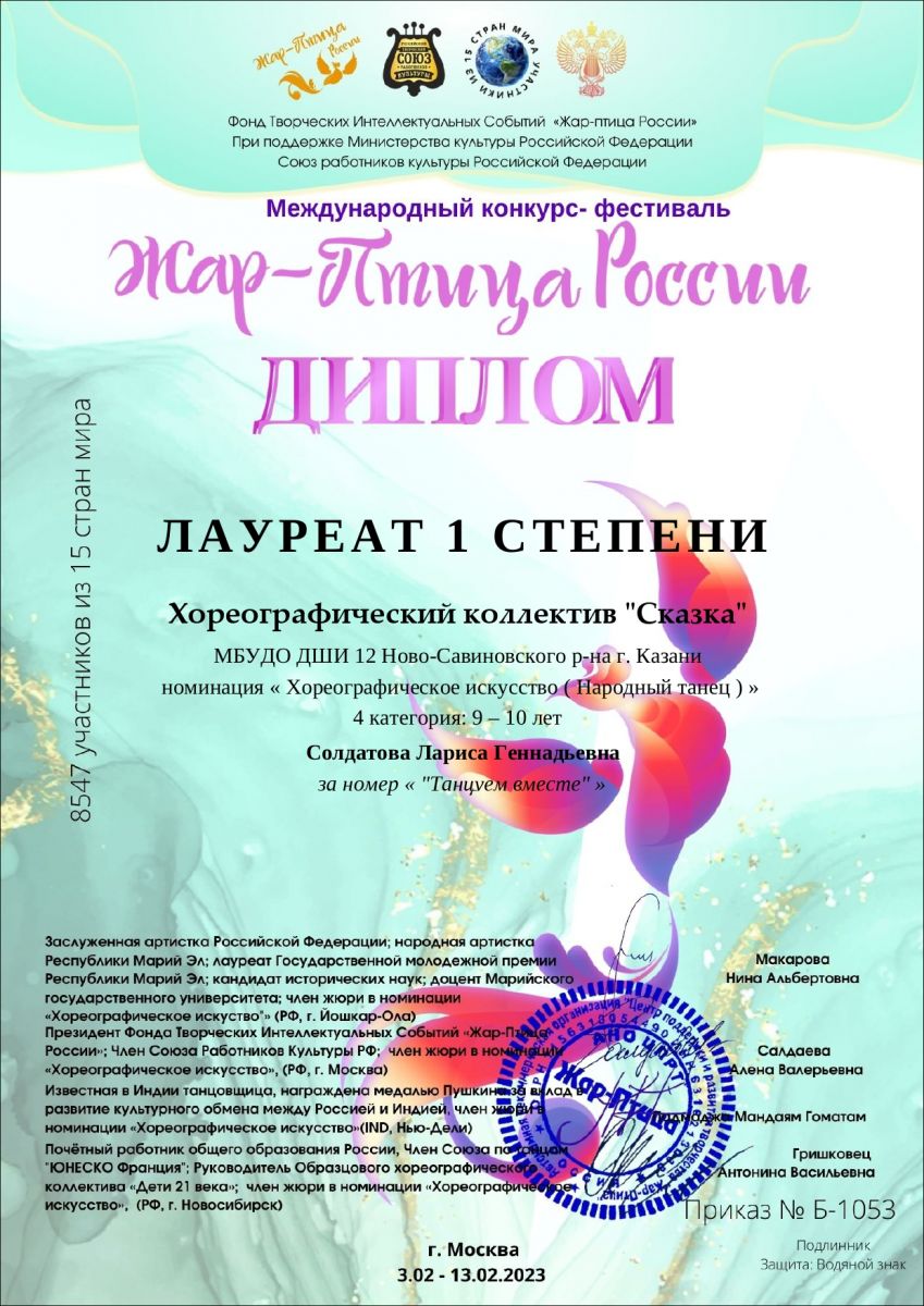 - Хореографический коллектив "Сказка" - Лауреатов 1 степени (преподаватель Солдатова Л.Г.) Номинация "Хореографическое искусство (Народный танец)", 9-10 лет