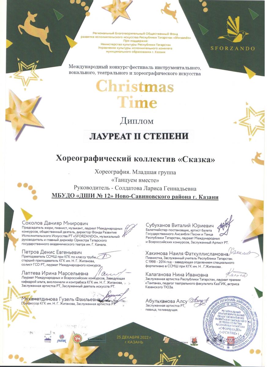 Поздравляем с успешным выступлением на Международном конкурсе-фестивале инструментального, вокального, театрального и хореографического искусства- Хореографический коллектив "Сказка" - Лауреатов 2 степени (преподаватель Солдатова Л.Г.), Номинация: Хореография. Возрастная категория: Младшая группа.