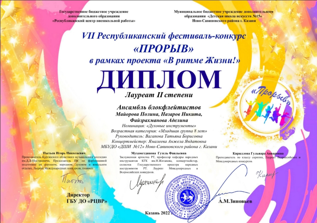 Поздравляем с успешным выступлением на VII Республиканском фестиваль-конкурсе "ПРОРЫВ" в рамках проекта "В ритме Жизни!" :- Ансамбль блокфлейтистов (Майорову Полину, Назарова Никиту, Файзрахманову Аделину) - Лауреатов 2 степени (преподаватель Вагапова Т.Б., концертмейстер Ямалеева А.Я.). Номинация: "Духовые инструменты". Возрастная категория: "Младшая группа 8 лет".