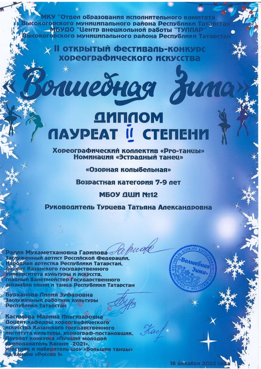 Поздравляем с успешным выступлением на II Открытом фестиваль-конкурсе хореографического искусства "Волшебная Зима":- Хореографический коллектив " Pro - танцы" - Лауреатов 2 степени (преподаватель Турцева Т.А.). Номинация "Эстрадный танец". Возрастная категория 7-9 лет.