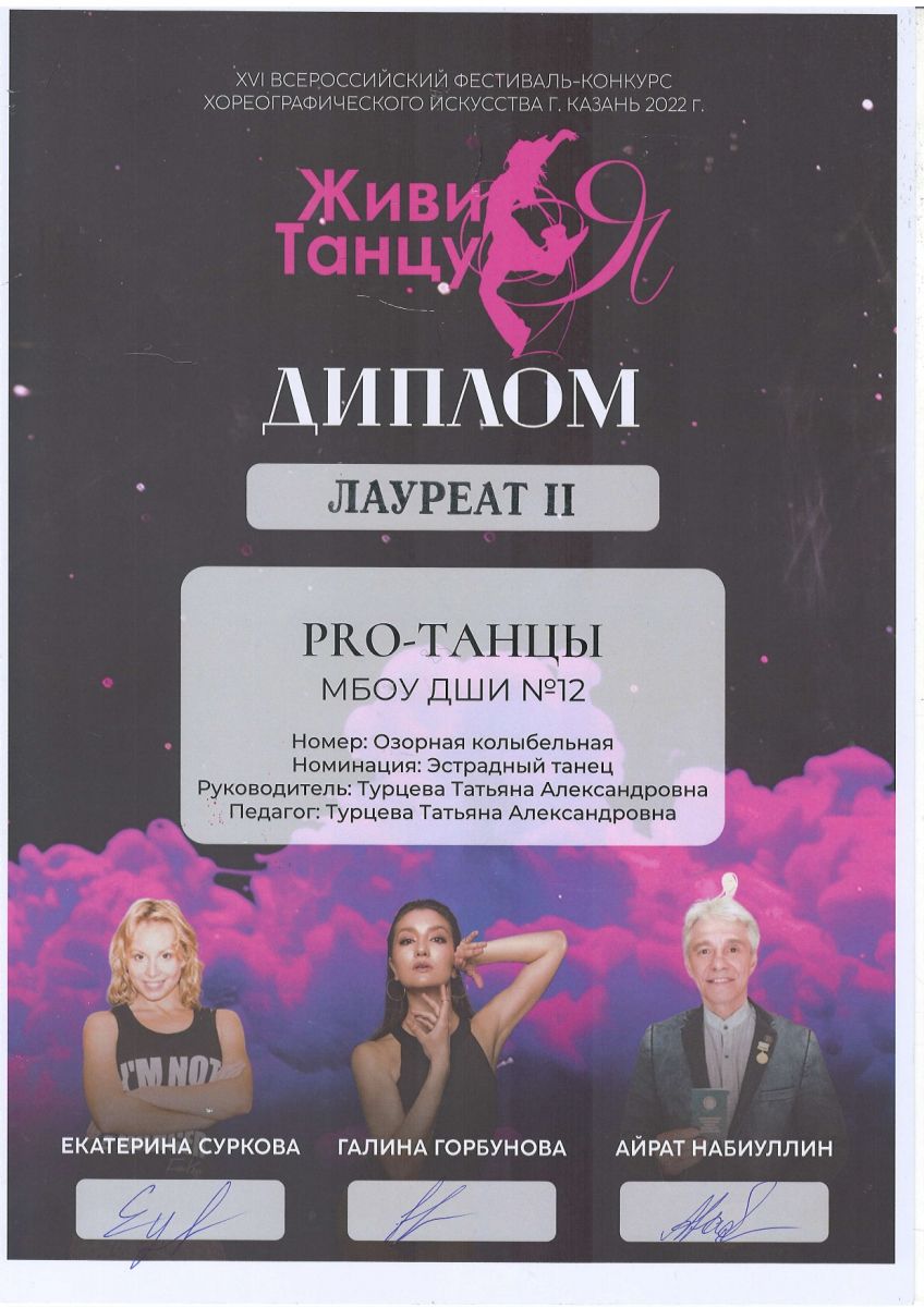 Поздравляем с успешным выступлением на XVI Всероссийском фестиваль-конкурсе хореографического искусства "Живи танцуюя":- Хореографический коллектив "PRO-танцы" - Лауреатов 2 степени (преподаватель Турцева Т.А.) номинация Эстрадный танец.
