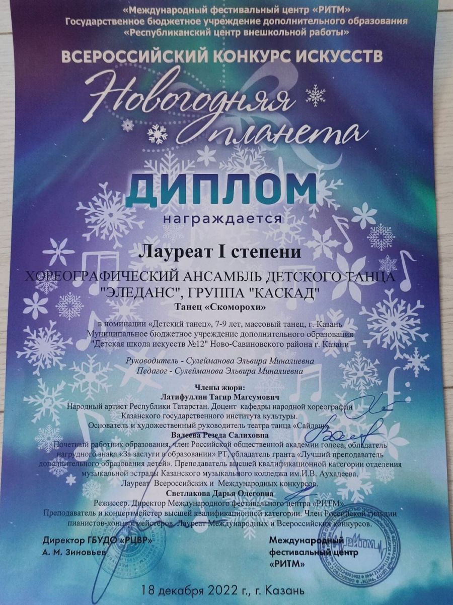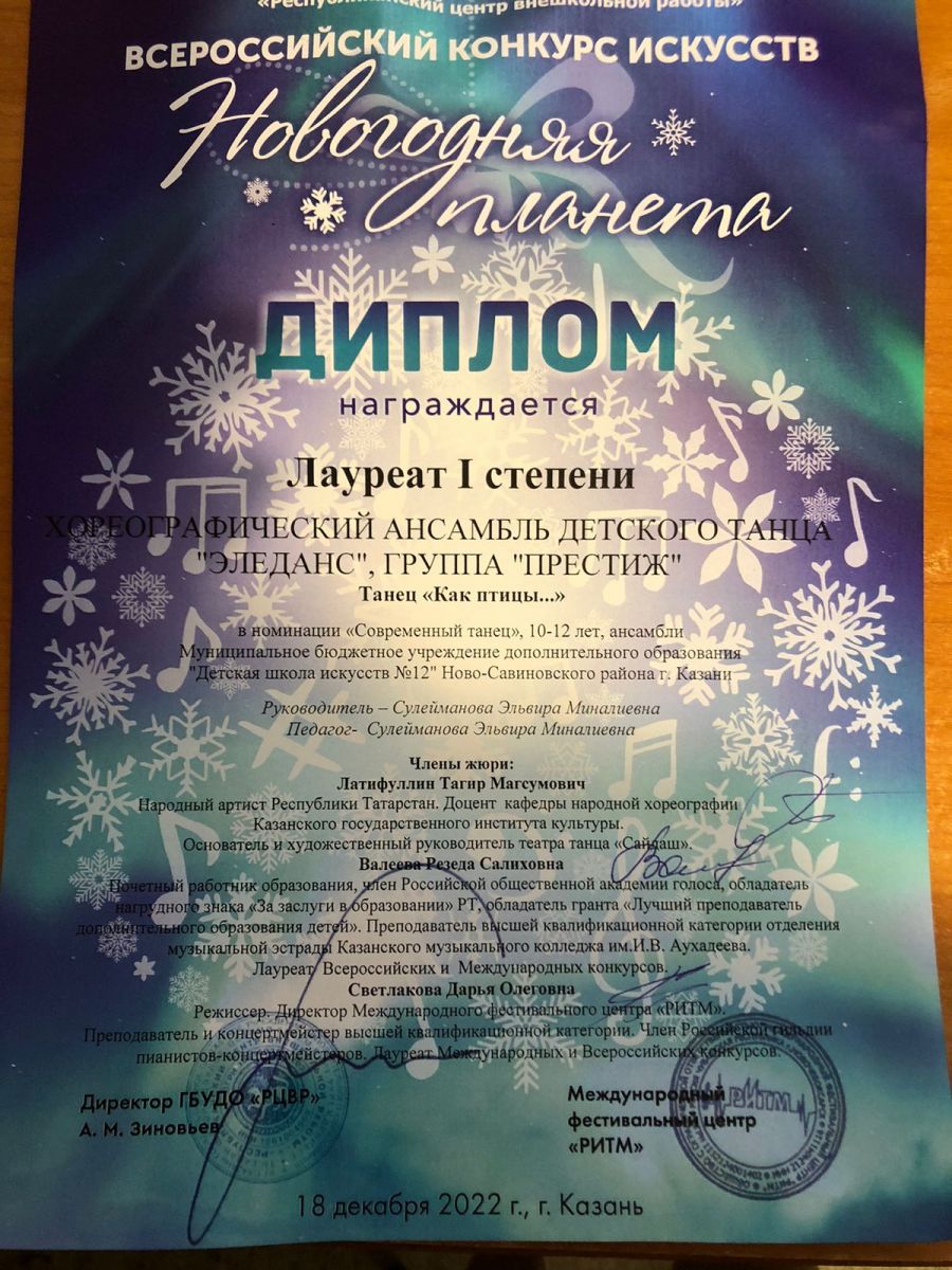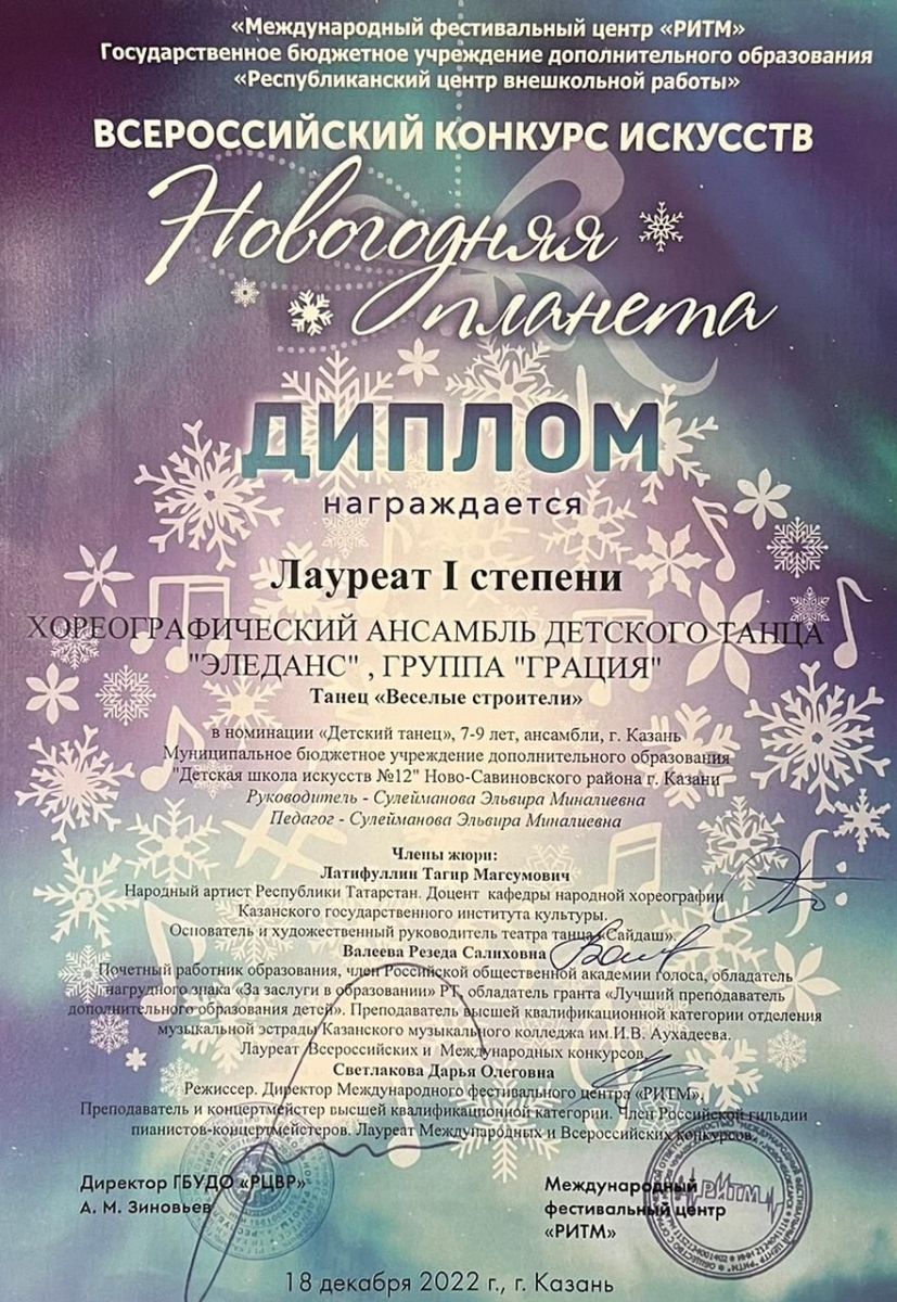 Поздравляем с успешным выступлением на Всероссийском конкурсе искусств "Новогодняя планета" хореографический ансамбль детского танца "Эледанс" (руководитель Сулейманова Э.М.):- группу "Грация" - Лауреата 1 степени