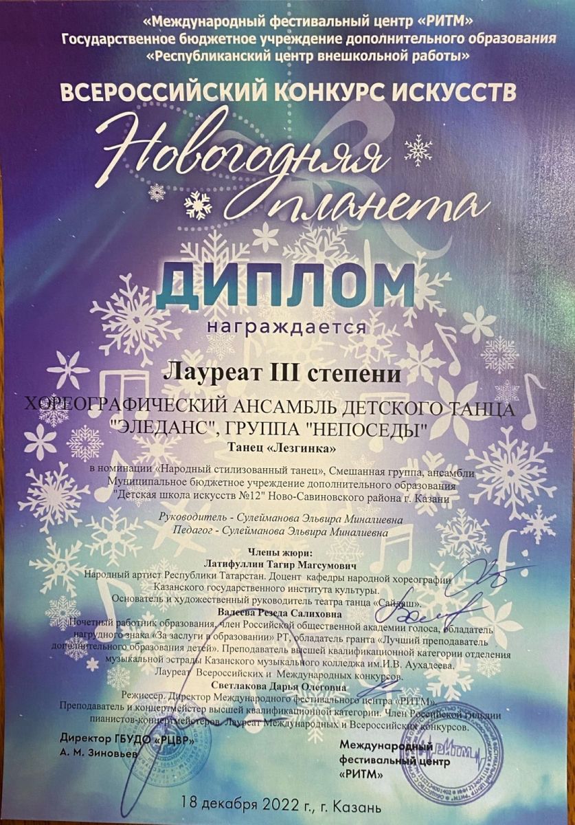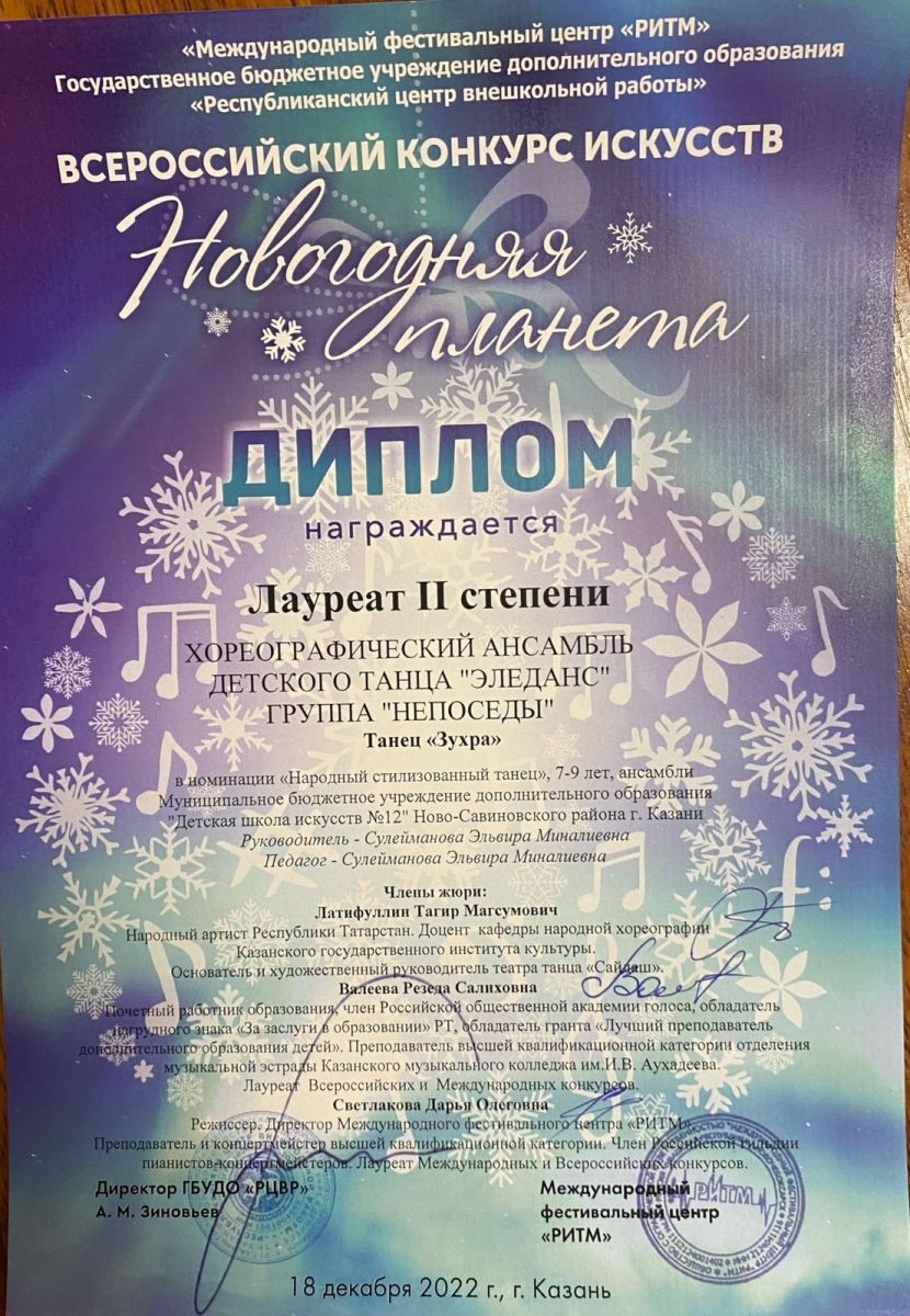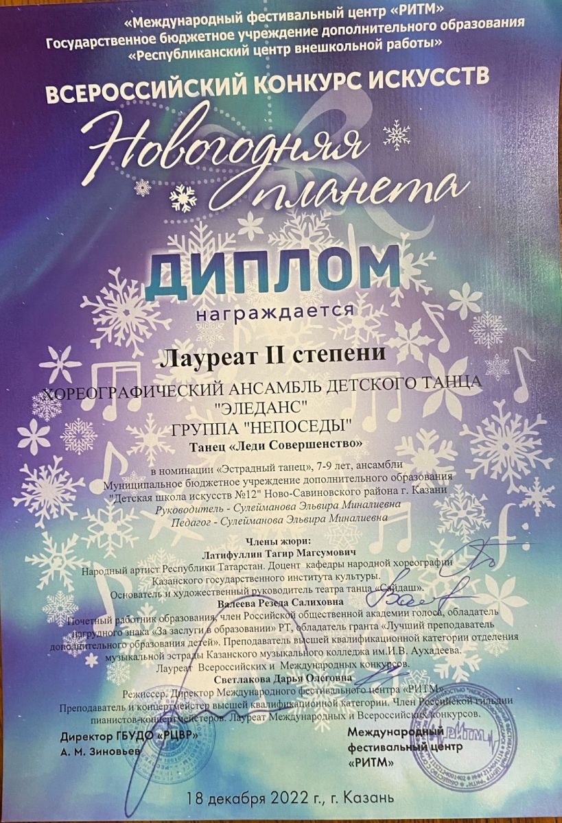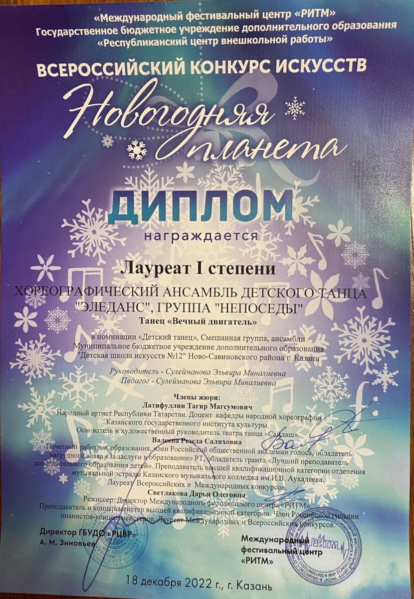 Поздравляем с успешным выступлением на Всероссийском конкурсе искусств "Новогодняя планета" хореографический ансамбль детского танца "Эледанс" (руководитель Сулейманова Э.М.):- группу "Грация" - Лауреата 1 степени