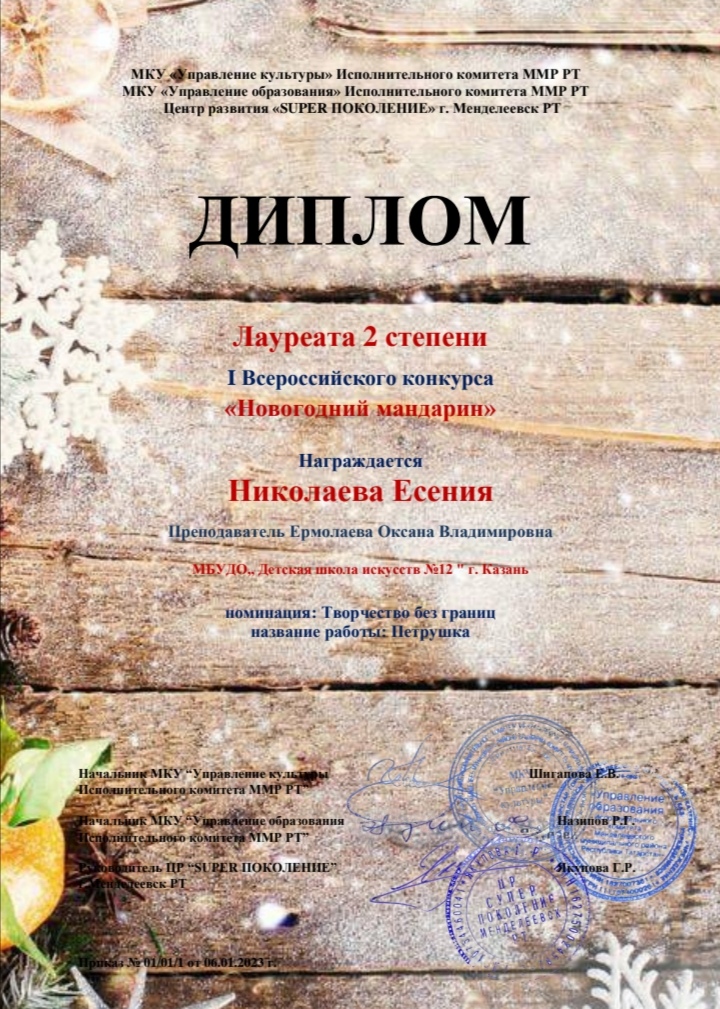 Поздравляем с успешным выступлением на 1 Всероссийском конкурсе "Новогодний мандарин":- Николаеву Есению - Лауреата 2 степени (преподаватель Ермолаева О.В.), Номинация: Творчество без границ.