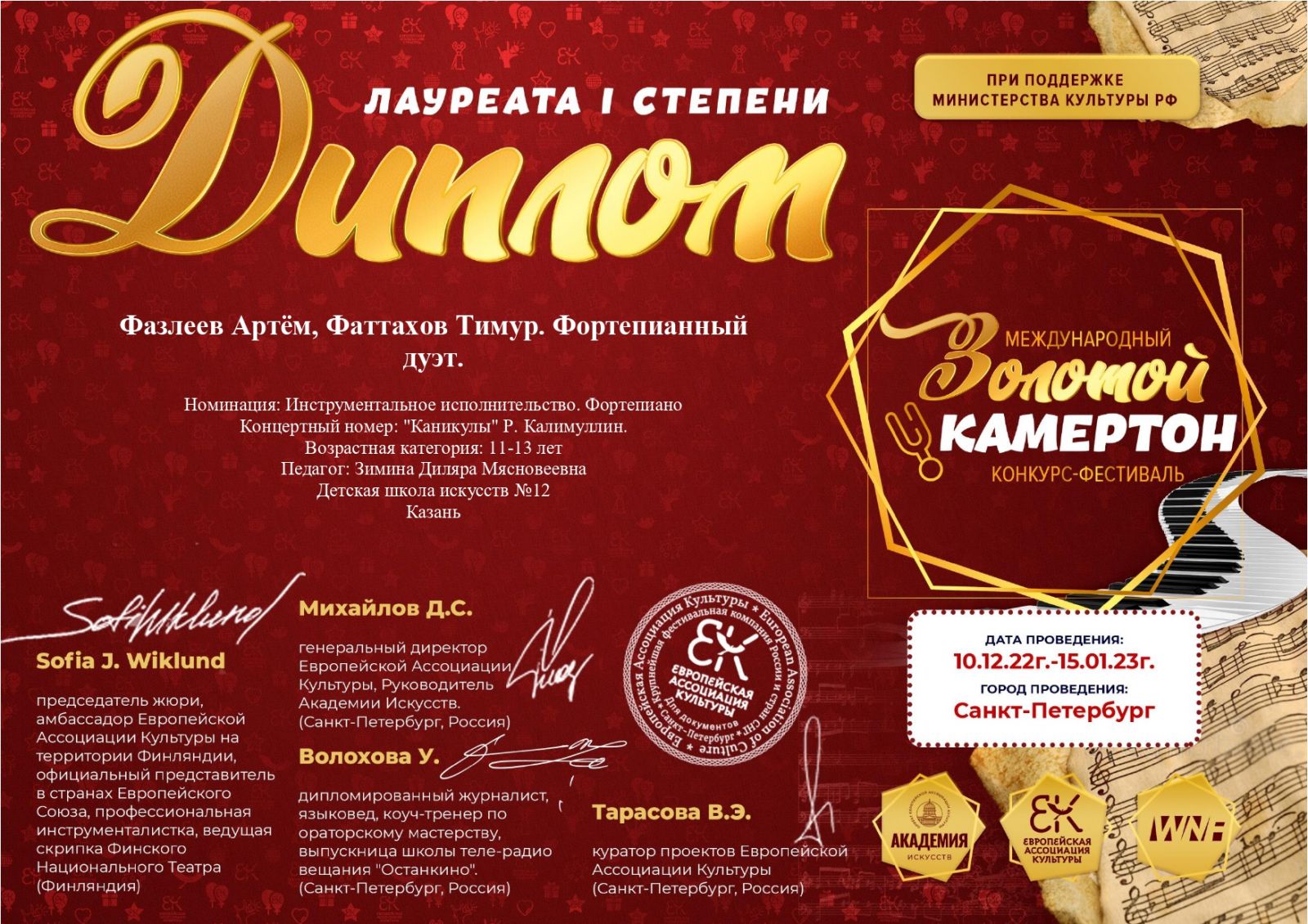 Поздравляеем с успешным выступлением на Международном конкурсе-фестивале "Золотой камертон":- Фортепианный дуэт: Фазлеева Артема, Фаттахова Тимура - Лауреатов 1 степени (преподаватель Зимина Д.М.). Номинация: Инструментальное исполнительство. Фортепиано. Возрастная категория: 11-13 лет.