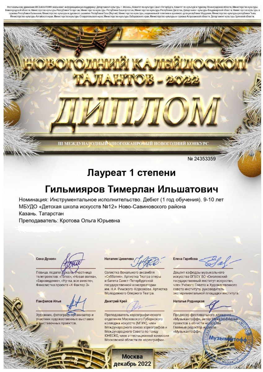 Поздравляем с успешным выступлением на 3 Международном многожанровом новогоднем конкурсе "Новогодний калейдоскоп талантов - 2022" :- Гильмиярова Тимерлана - Лауреата 1 степени (преподаватель Кротова О.Ю.) Номинация: Инструментальное исполнительство. Дебют (1 год обучения).
