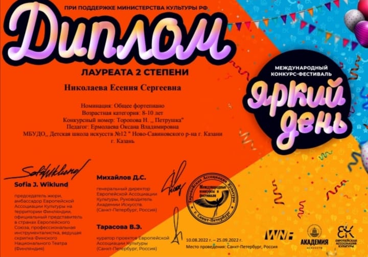 Поздравляем с успешным выступлением на Международном конкурс-фестивале "Яркий день":- Николаеву Ксению - Лауреата 2 степени. (преподаватель Ермолаева О.В.). Номиная : Общее фортепиано. Возрастная категория: 8-10 лет.