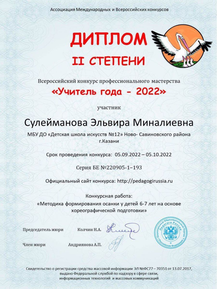 Поздравляем Сулейманову Эльвиру Миналиевну, преподавателя хореографии "ДШИ №12", с победой на Всероссийском конкурсе профессионального мастерства "Учитель года - 2022"!. Желаем дальнейших успехов!