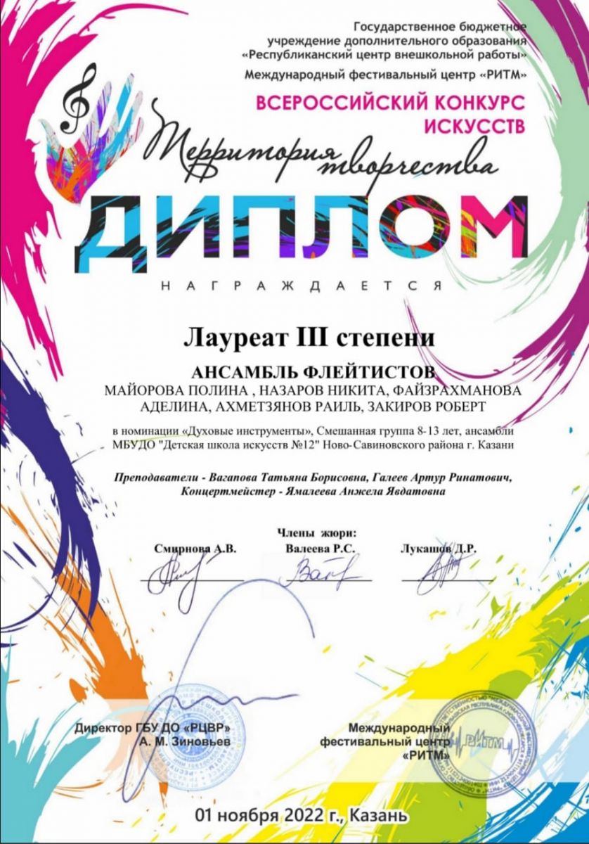 Поздравляем с успешным выступлением на Всероссийском конкурсе искусств "Территория творчества"- ансамбль флейтистов: Майорову Полину, Назарова Никиту, Файзрахманову Аделину, Ахметзянова Раиля Закирова Роберта - Лауреатов 3 степени ( преподаватели Вагапова Т.Б., Галеев А.Р., концертмейстер Ямалеева А.Я.) в номинации "Духовые инструменты", смешанная группа 8-13 лет.