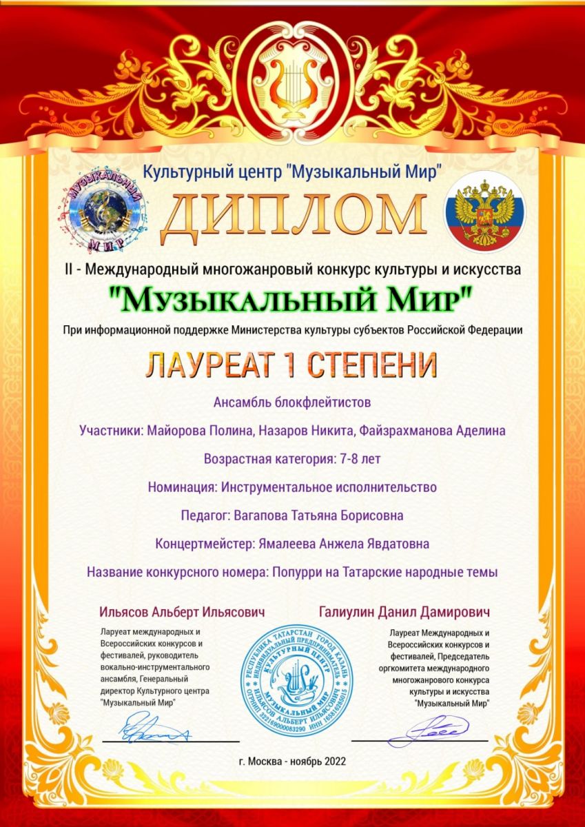 Поздравляем с успешным выступлением на II- Международном многожанровом конкурсе культуры и искусства "Музыкальный мир":- Ансамбль блокфлейтистов: Майорову Полину, Назарова Никиту, Файзрахманову Аделину - Лауреатов 1 степени. (преподаватель Вагапова Т.Б., концертмейстер Ямалеева А.Я.)