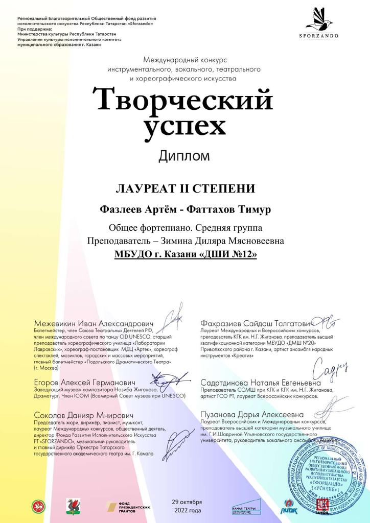 Поздравляем с успешным выступлением на Международном конкурсе инструментального, вокального, театрального и хореографического искусства:- Фазлеева Артема и Фаттахова Тимура - Лауреатов 2 степени. (преподаватель Зимина Д.М.) Общее фортепиано. Средняя группа.