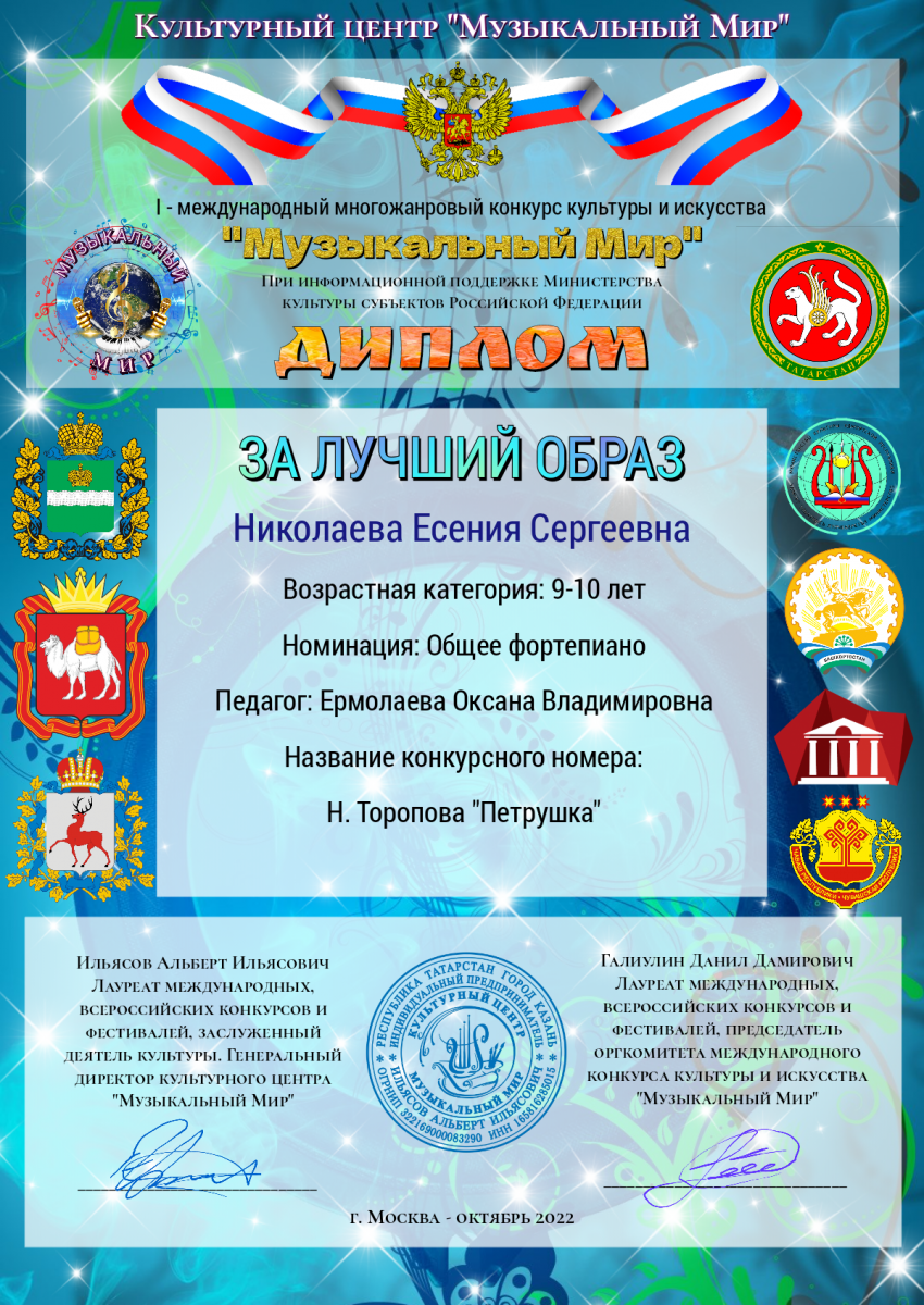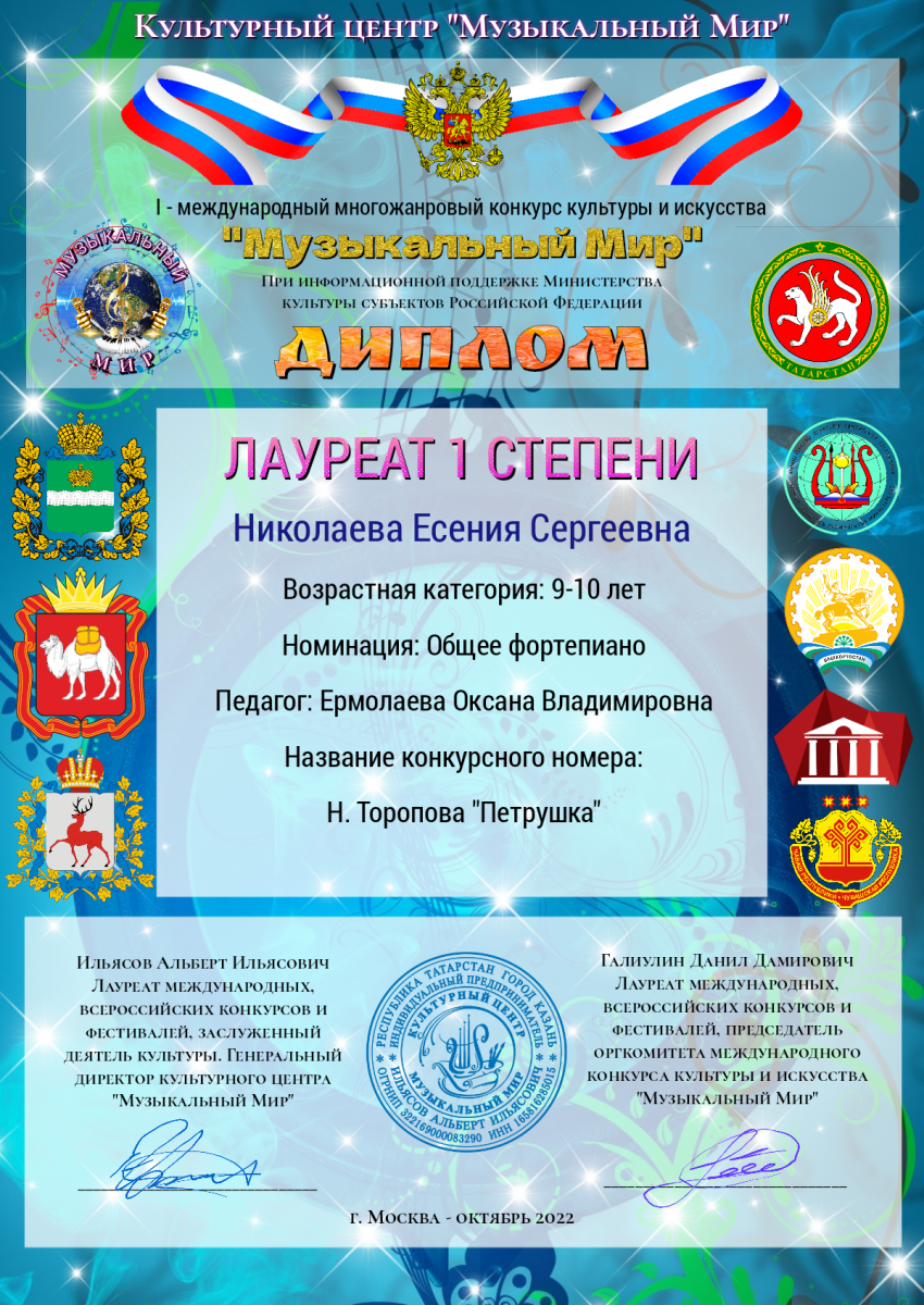 Поздравляем с успешным выступлением на I Международном многожанровом конкурсе культуры и искусства "Музыкальный Мир" - Николаеву Есению - Лауреата 1 степени (преподаватель Ермолаева О.В.) Номинация: Общее фортепиано. Возрастная категория 9-10 лет. Есения так же получила диплом за Лучший образ.