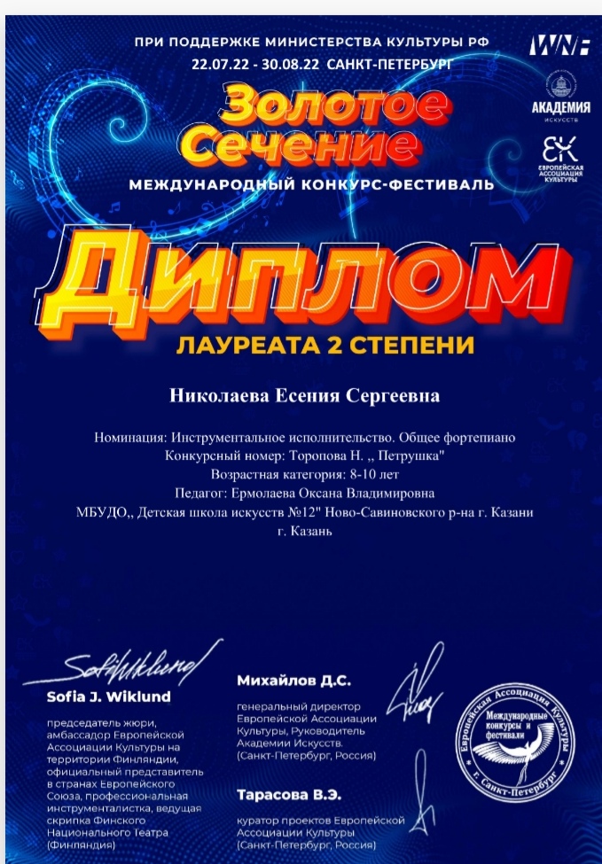 Поздравляем с успешным выступлением на Международном конкурсе-фестивале "Золотое сечение" :- Николаеву Ксению - Лауреата 2 степени (преподаватель Ермолаева О.В.). Номинация: Инструментальное исполнительство. Общее фортепиано. Возрастная категория 8-10 лет.