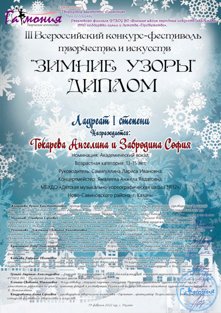 Поздравляем с успешным выступлением на III Всероссийском конкурсе-фестивале творчества и искусств "Зимние узоры":- Токареву Ангелину и Забродину Софию (дуэт) - Лауреатов 1 степени (преподаватель Самигуллина Л.И., концертмейстер Ямалеева А.Я.)