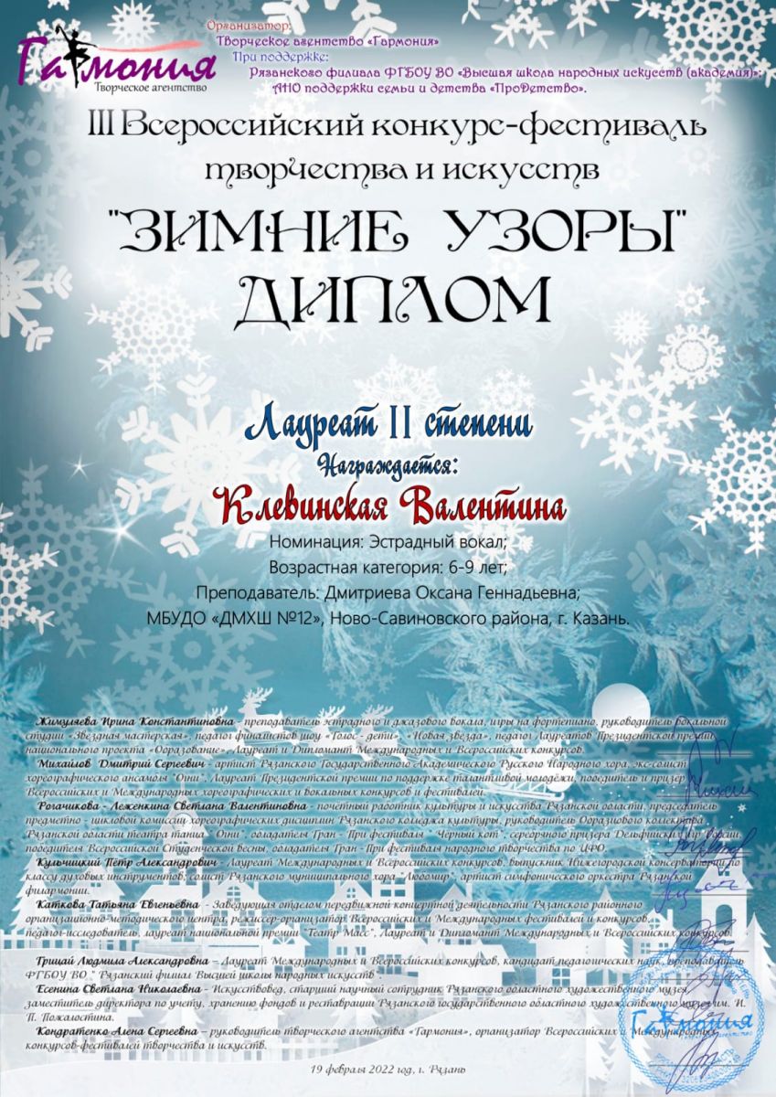 - Клевинскую Валентину - Лауреата 2 степени (преподаватель Дмитриева О.Г.)