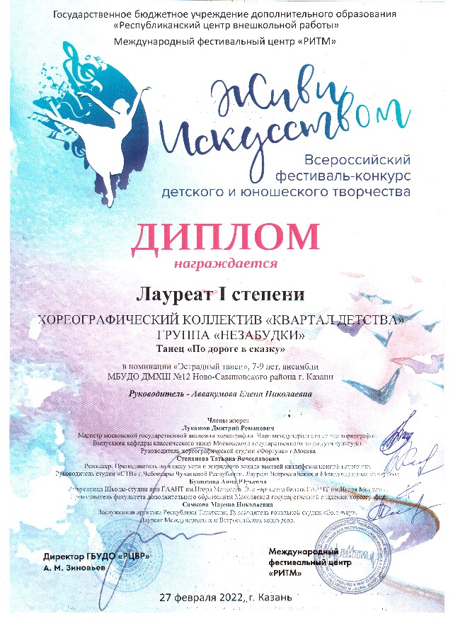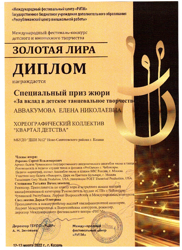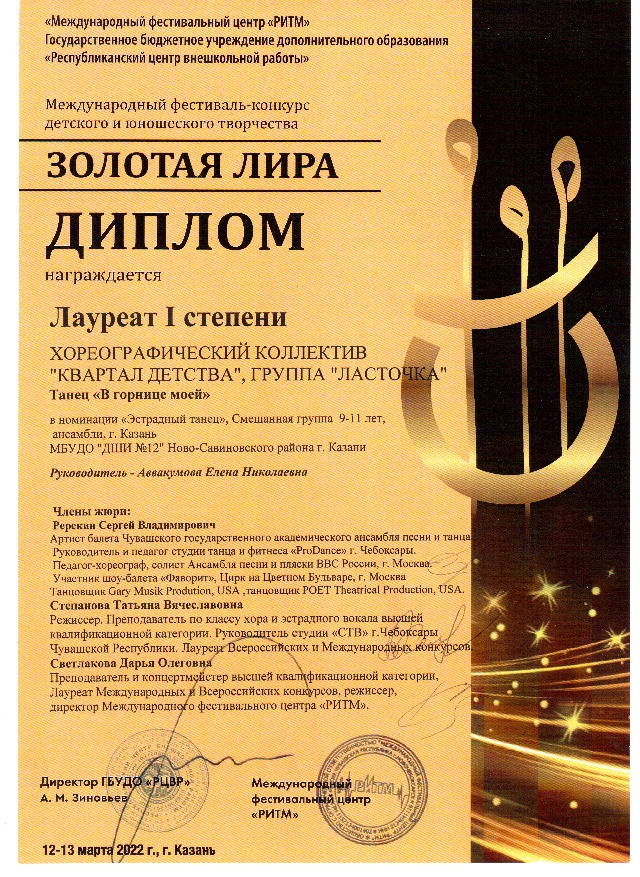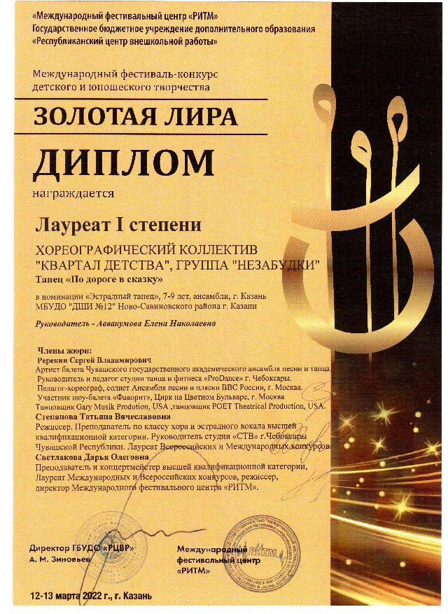 Поздравляем с успешным выступлением на Международном фестиваль-конкурсе детского и юношеского творчества "Золотая лира" учащихся преподавателя хореографии Аввакумовой Елены Николаевны, хореографический коллектив " Квартал Детства":- группу "Незабудки" - Лауреата 1 степени